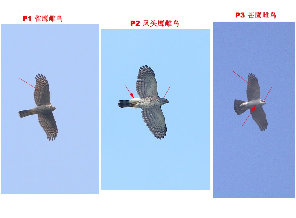 4:细节-中远距离的苍鹰和凤头鹰可以看到头部有明显的对比深色区域。凤头鹰的范围较大。苍鹰还有明显的白色眉纹;苍鹰和雀鹰成鸟的胸腹部以白底深(褐)色横纹为主,但苍鹰的横纹较细,所以远看胸腹部几乎纯白,凤头鹰则有上纵下横的对比纹路、喉部还有明显的喉中线;凤头鹰成鸟的尾下覆羽相当发达,经常膨大成”纸尿布“突出于身体两侧;苍鹰成鸟的翅下纹路明显不同于雀鹰和凤头鹰,比较浅,只有初级飞羽处有横纹贯过,次级飞羽和翅下覆羽纹路很浅,因此远看基本呈白色。