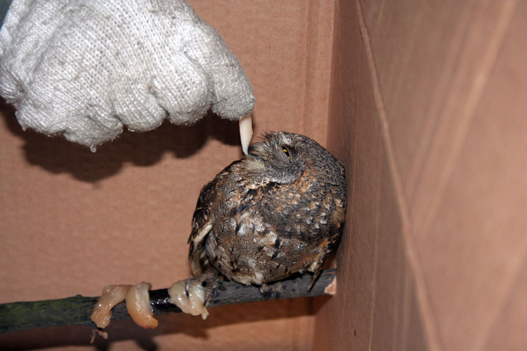 2010年04月27日,我们协会的心有鱼从网友@@可可麦处,救回一只东方角鸮。心有鱼专门从淘宝上买了小白鼠喂养这只东方角鸮。进行了几天的喂养。